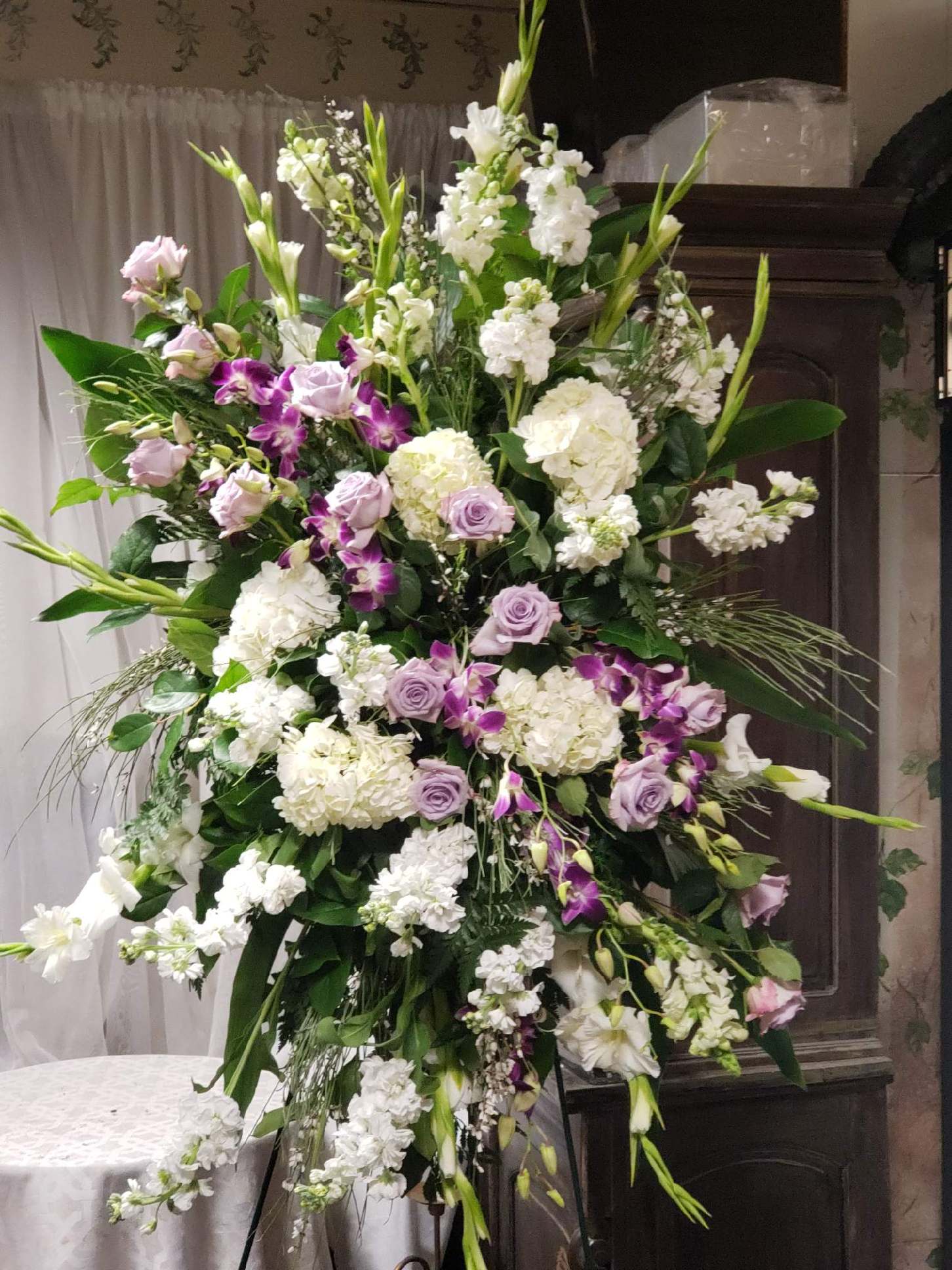 A lush, garden-style sympathy arrangement blending white, cream, and the softest hints of Lavender. Designed to evoke serenity and heavenly beauty, this piece brings warmth and comfort to grieving hearts.