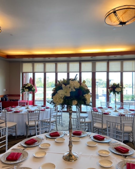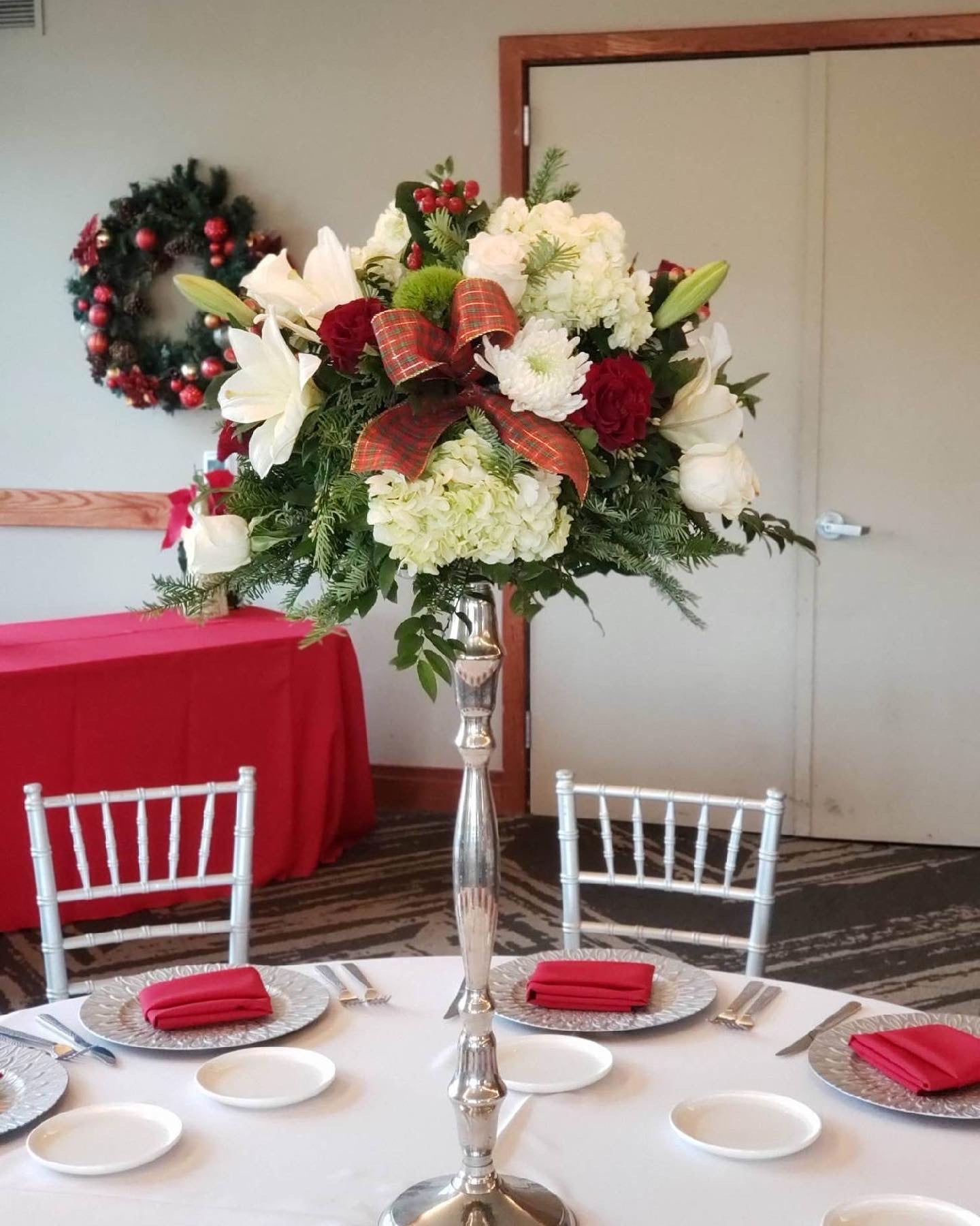 This stunning centerpiece is perched on a tall, gleaming silver stand, adding height and sophistication to any table. The arrangement features a lush mix of traditional Christmas greenery, including pine branches and cedar sprigs, artfully woven to evoke a natural and festive charm. White flowers such as snowy roses or chrysanthemums blend seamlessly with vibrant red blooms creating a striking holiday contrast. Nestled among the foliage are accents of crimson berries, shimmering silver and red bows, and a sprinkle of frosted elements to evoke a wintry feel. The elevated design ensures the arrangement remains a centerpiece without obstructing views, making it perfect for conversations at a holiday gathering. This elegant display brings together timeless Christmas colors and textures for a truly festive ambiance. Perfect for Corporate events and large gatherings