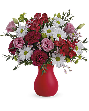 Celebrate Mom with Blooms as Beautiful as She Is Show your love and appreciation this Mother’s Day with our radiant Crimson Kiss Bouquet, thoughtfully designed to warm her heart. Bursting with a joyful mix of pink lisianthus, fuchsia carnations, white daisy spray chrysanthemums, pink limonium, and red alstroemeria, this vibrant arrangement is a heartfelt tribute to everything she is. Accented with bupleurum, leatherleaf fern, and parvifolia eucalyptus, and presented in our signature crimson-kissed glass vase, it’s a stunning way to say “Thank you, Mom” from near or far.
