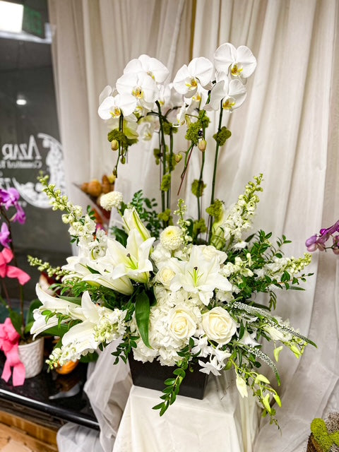A breathtaking blend of timeless beauty and refined elegance, Eternal Grace is our signature orchid arrangement designed to leave a lasting impression. Featuring pristine phalaenopsis orchid stems paired with premium seasonal blooms like roses, white ranunculus, lilies, and hydrangeas—this arrangement is a harmonious balance of softness and sophistication. Expertly arranged in a modern container, Eternal Grace is ideal for anniversaries, sympathy gestures, milestone celebrations, or simply to elevate your space with natural luxury.