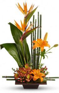 Send good feng shui someone's way with this striking arrangement. Orange flowers, gorgeous green ti leaves and small bamboo-like canes are arranged in a balanced, Zen-like composition. Ingredients may change with availability.
