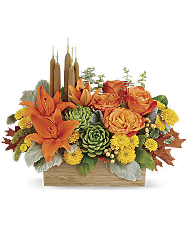 Enjoy the serenity of the season with a fresh fall centerpiece that is as beautiful as it is soothing. This lush arrangement enchants in shades of peach, orange and green - combining roses, lilies and even two succulent plants! Hand-delivered in a natural-toned bamboo rectangle. This gorgeous centerpiece arrangement features orange roses, orange asiatic lilies, yellow cushion spray chrysanthemums, peach hypericum, millet, cattails and two succulent plants, and finished with dusty miller, spiral eucalyptus and lemon leaf. Delivered in Teleflora's Natural Bamboo Rectangle. Orientation: One-Sided