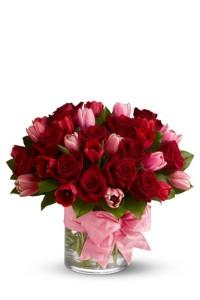 Tell someone, "I love you!" with two of nature's most beautiful blooms--fragrant crimson roses for romance, and delicate pink tulips to signify friendship and devotion. Accented with a big pink bow, this magnificent floral gift will create a sensation.