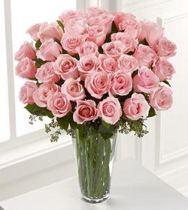 Picture-perfect soft pink roses make a beautiful gift for the lovely lady in your life. Wife, mother, daughter or sweetheart, she's sure to cherish this bouquet of 36 stems of pastel pink roses accented with seeded eucalyptus and arranged in a clear glass vase.