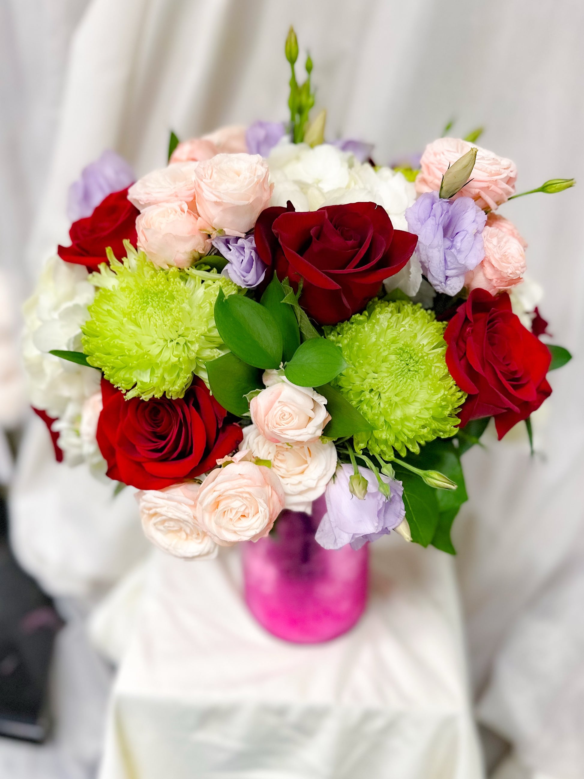 Light up their heart with this radiant arrangement, designed to capture the magic of love. Featuring lush roses, cheerful mums, delicate spray roses, and elegant lisianthus, this bouquet is a perfect balance of romance and charm. Its vibrant blooms create a sparkling display that’s ideal for anniversaries, celebrations, or simply letting someone special know how much they mean to you.