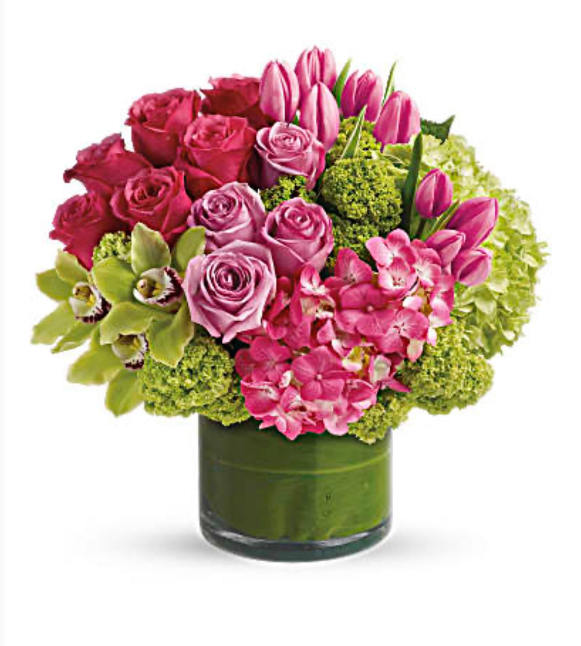 Embrace the beauty of spring with Tulips, Roses, Orchids and Hydrangea. Perfect For Mother's Day this bouquet is bursting with vibrant hues and delicate petals.