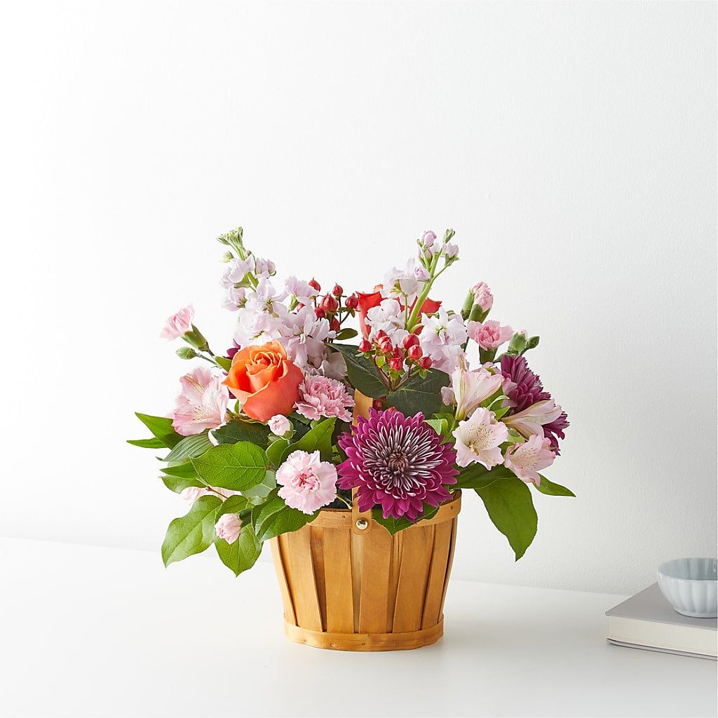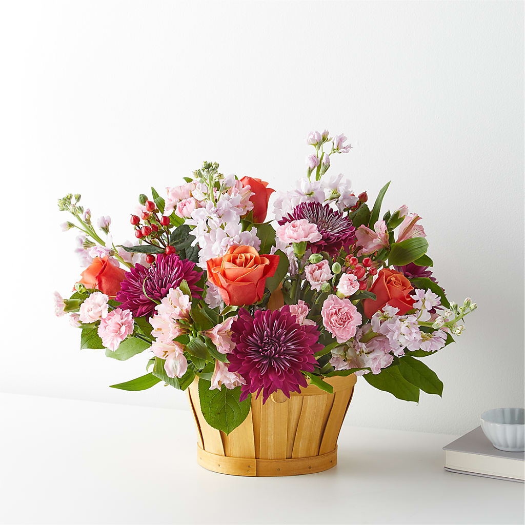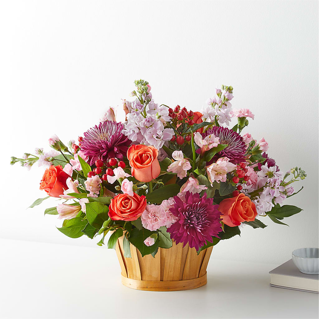 They'll have a field day with this bountiful basket full of disbud mums, alstroemeria, carnations, roses, and hypericum berries.