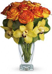 It's a tropical treasure! A stunning modern arrangement featuring one dozen orange bi-color roses and fresh yellow cymbidium orchids, this beautiful bouquet seems to glow with the warm spirit of Aloha.